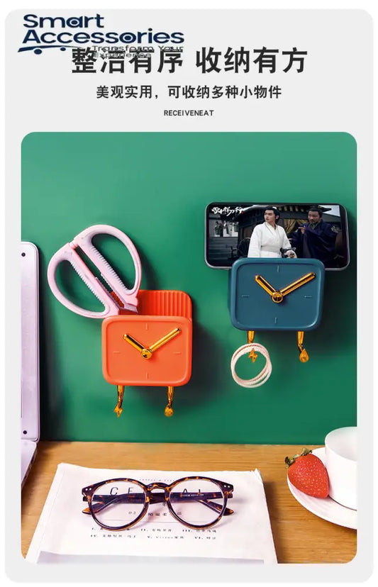 Creative Clock Wall Hanging Storage Box with Hook Kitchen Bathroom Bedside Organizer Shelf Mobile Phone Holder