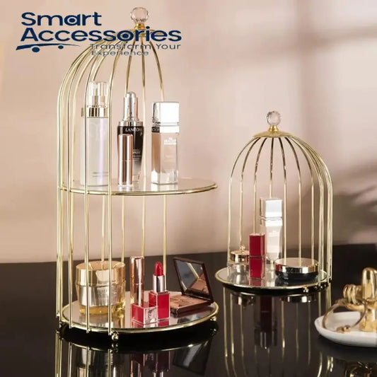 New Style Birdcage Makeup Organizer Metal Brass Cosmetic Organizer with Mirror Shelves