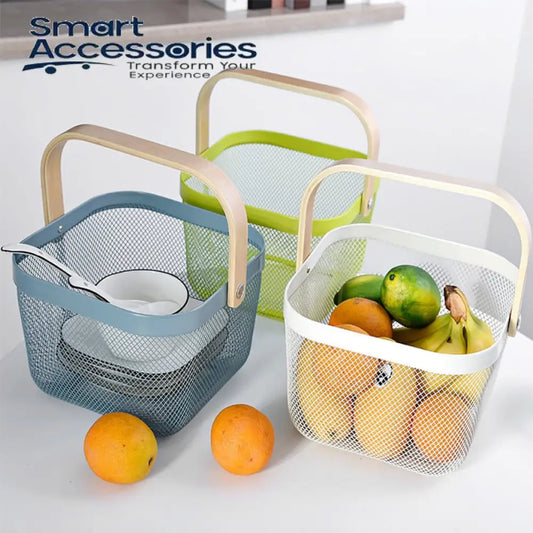 Kitchen Organizer Metal Wire Mesh Fruit Storage Basket with Wooden Handle