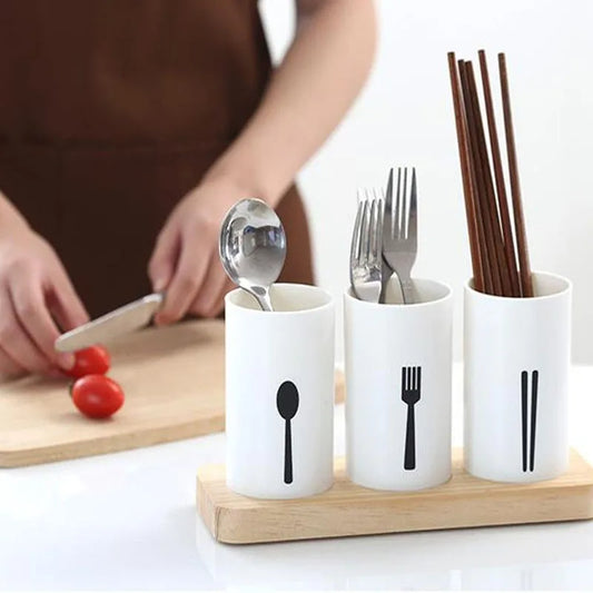 Ceramic Utensil Holder Set with Wooden Base – Stylish Kitchen Storage Solution