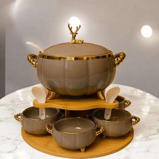 16-Piece Royale Soup Set With Wooden Stand White and Golden