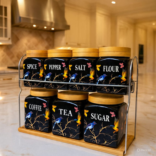 Premium Sugar Tea Coffee Ceramic Jar Set With Bamboo Lids & Tray