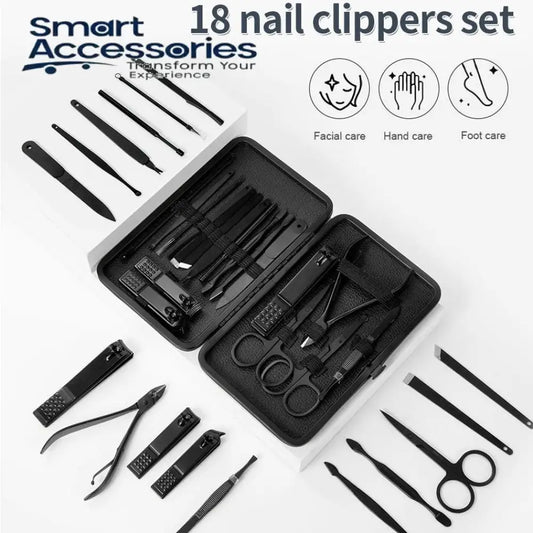 Set Of 18 Classic Black Nail Clipper, Hand Feet Facial Accessories, Stainless Steel Pedicure Kit, Nippers Trimmer Care Tool With Travel Case Kit, Household Pedicure Kit