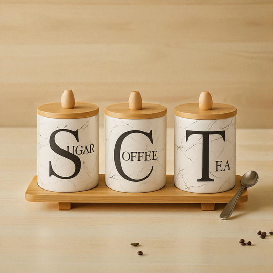 Premium Sugar Tea Coffee Ceramic Jar Set With Bamboo Lids & Tray