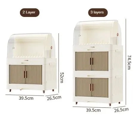 Multi-Layer Design: Upper rack for plates, middle shelf for bowls, and lower shelf for cups and utensils.