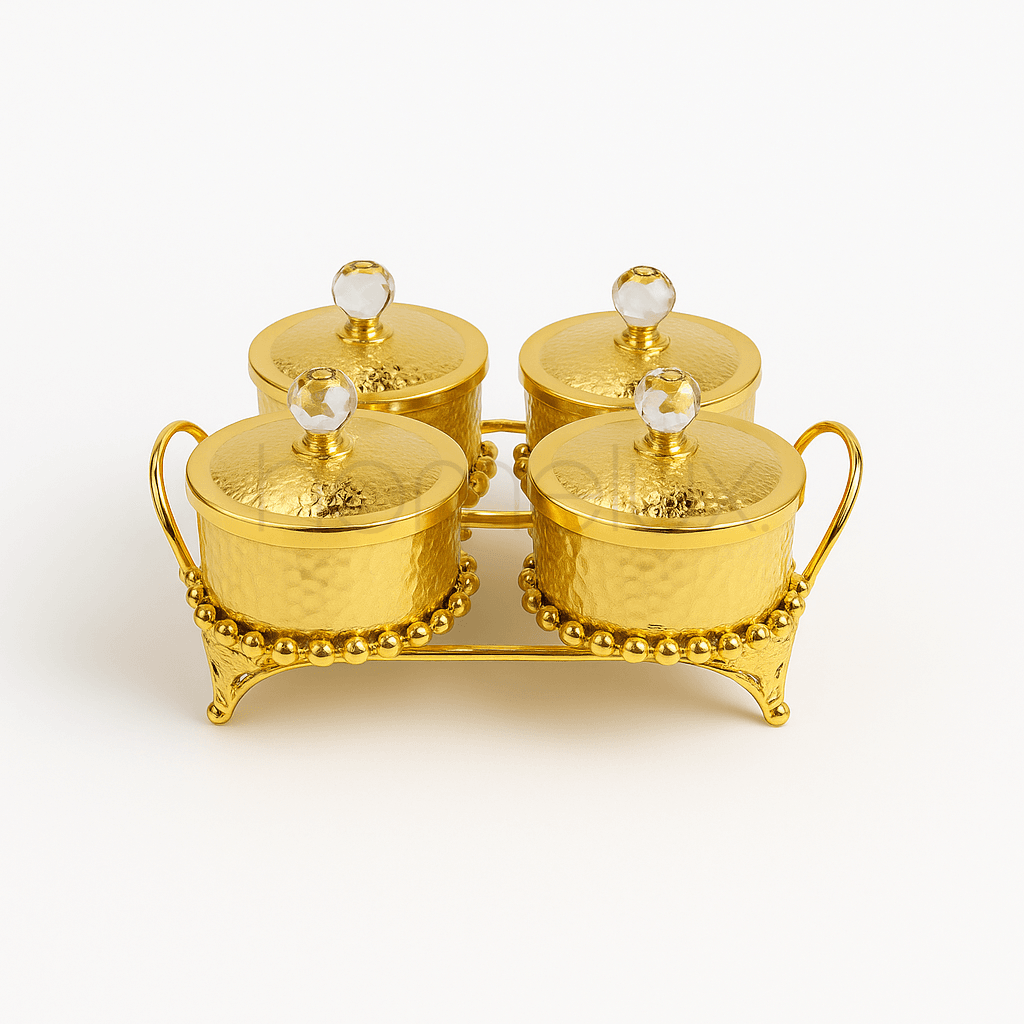 This luxurious 4-piece condiment set is designed with hammered golden bowls and matching lids, each adorned with a crystal knob for a touch of elegance. Arranged neatly in a decorative golden stand with ornate detailing, it’s a perfect blend of style and function. Ideal for condiments, spices, dry fruits, or sweets, this set adds a royal charm to your dining table or kitchen.