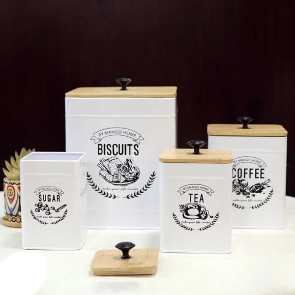 This Metal Food Containers Set includes four durable metal canisters with eco-friendly bamboo lids, designed for convenient storage of biscuits, coffee, sugar, and tea. The set features containers in sizes ranging from 1.3 to 8 liters, perfectly suited for maintaining freshness and organizing your pantry. Available in black and white, each container is crafted to fit various kitchen needs, combining practicality with a sleek, modern design. Dimensions are tailored for optimal space usage: the biscuit box measures 18 x 19 x 24 cm, coffee 14 x 14 x 17 cm, tea 11 x 11 x 15 cm, and sugar 10 x 10 x 15 cm.