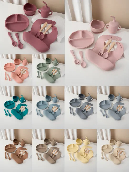 Crafted from 100% food-grade silicone, each item in this set is safe, durable, and easy to clean. The centerpiece of the set is the Silicone Divided Suction Plate, designed with strong suction to adhere securely to any flat surface, preventing spills and messes. Its divided sections make it perfect for introducing a variety of foods and promoting self-feeding skills.
